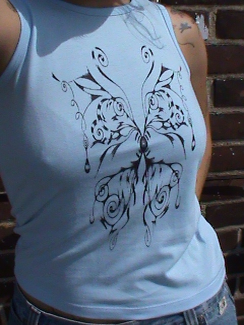 The butterfly tank’s design was hand drawn and screenprinted by hand :) Each shirt has a custom tag and is made with lots of care. Blue buttefly tanks are printed with dark brown ink.
